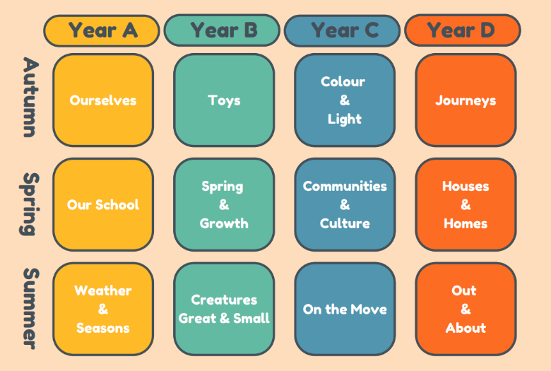 Due to the nature of the classroom, the children are likely to be accessing this room for more than one year, so the topics are on a rotation. This year we are working in Year A.